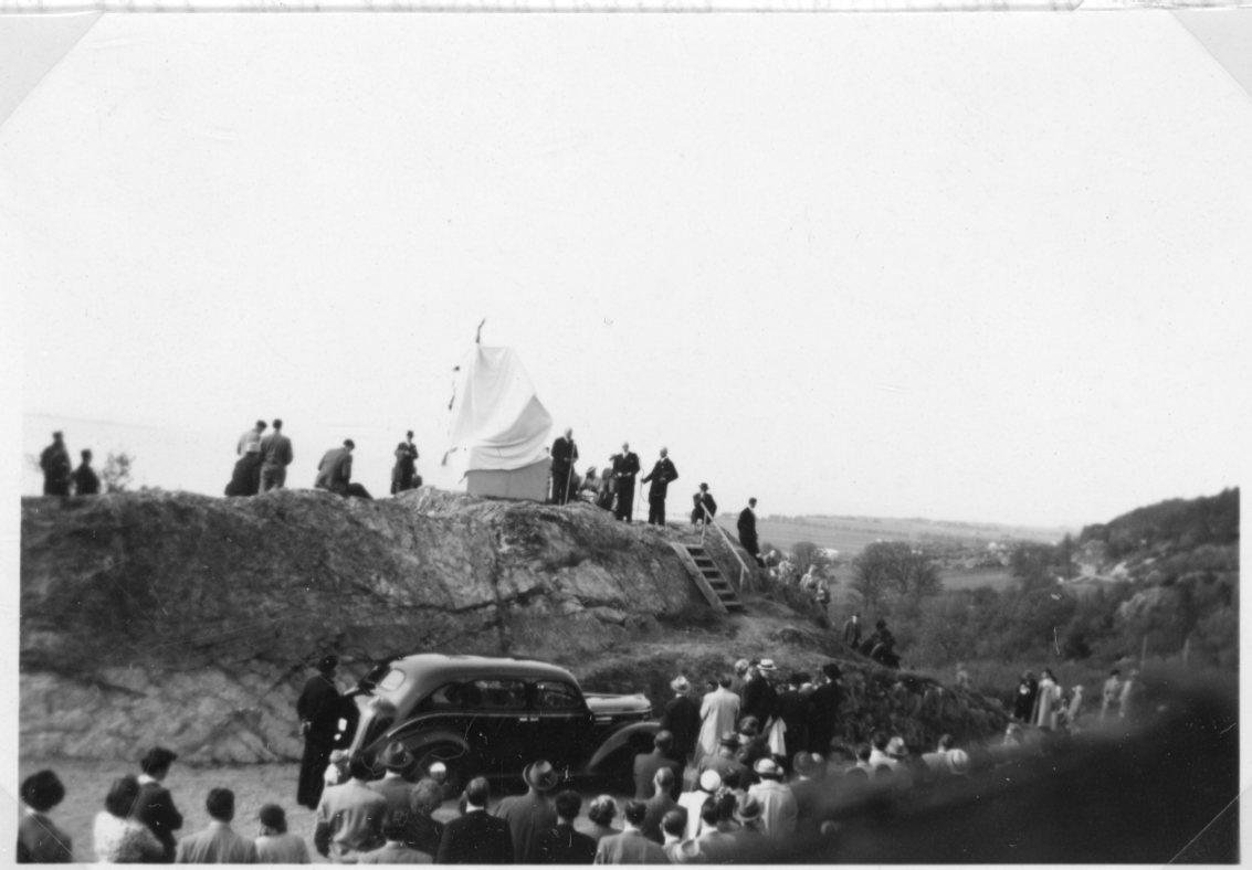 Ett tyg ligger över en skulptur som står på en bergknalle - Kråkberget - strax söder om Gränna. Folksamling runt omkring. Det är dags för avtäckning av skulpturen "Löparna".