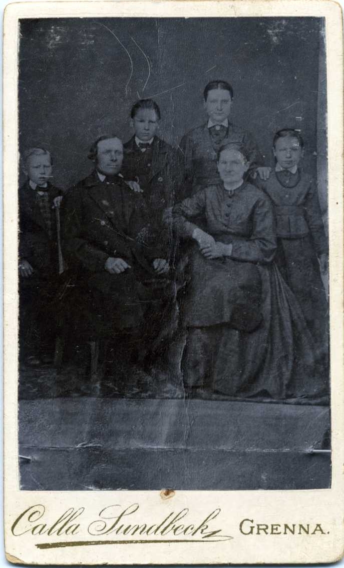 Kabinettsfotografi: gruppbild med okänd familj. Föräldrar omgivna av två söner och två döttrar.
