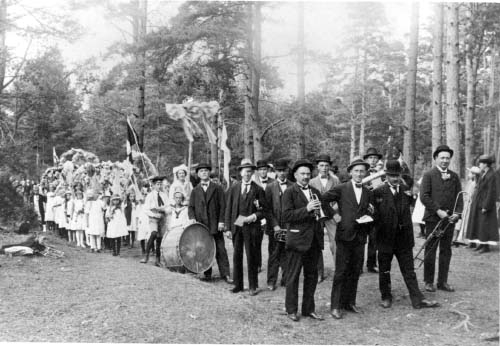 Munksjö musikkår står på ett led med barn och vuxna med blomsterbågar i följet.