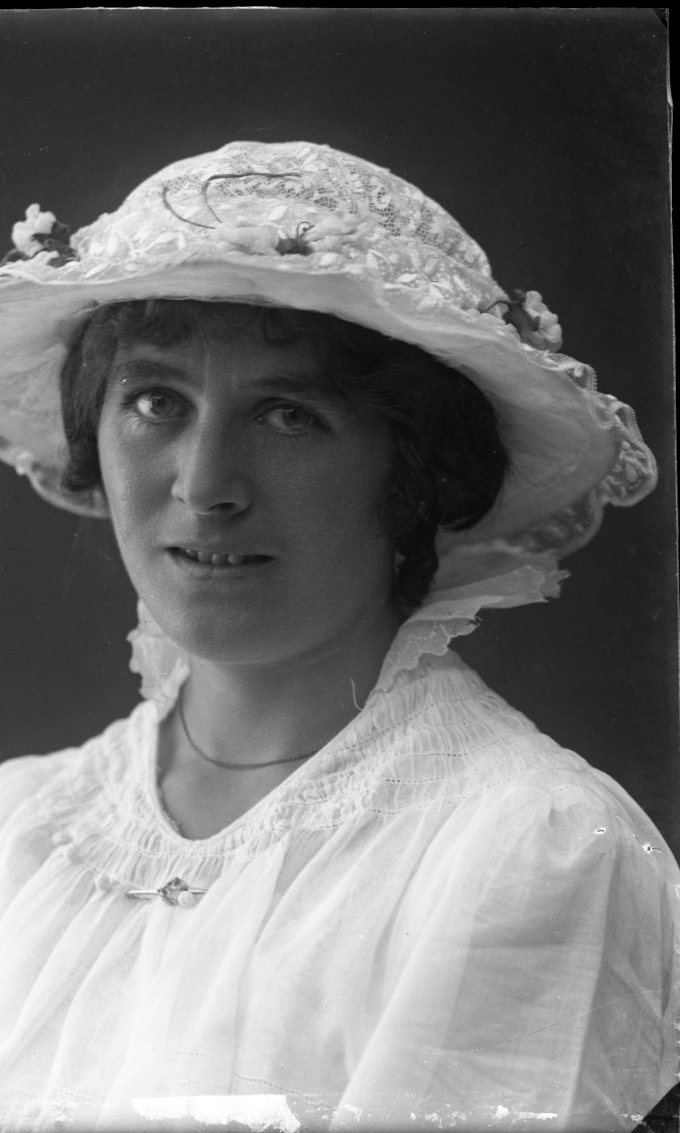 Porträtt av en kvinna med tunn, ljus hatt av spets.