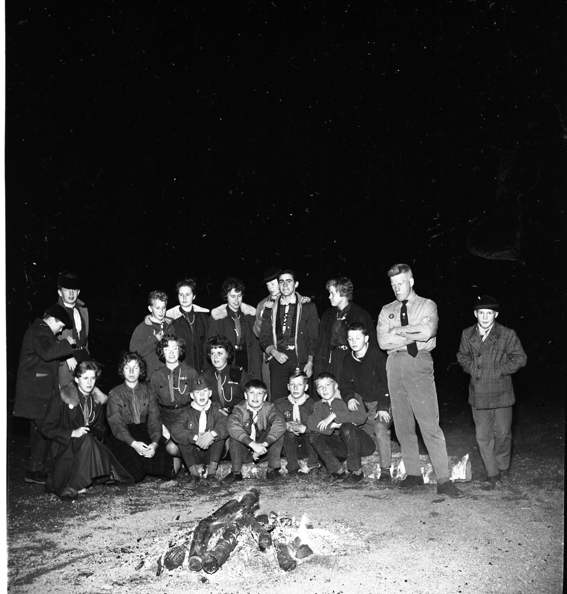 Några scouter står uppställda framför en lägereld.
