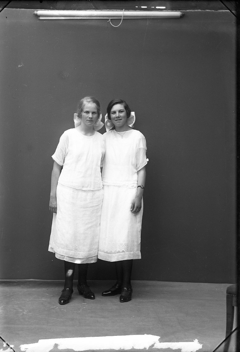 Porträtt av två flickor i vita klänningar. Möjligen konfirmationsbild.
