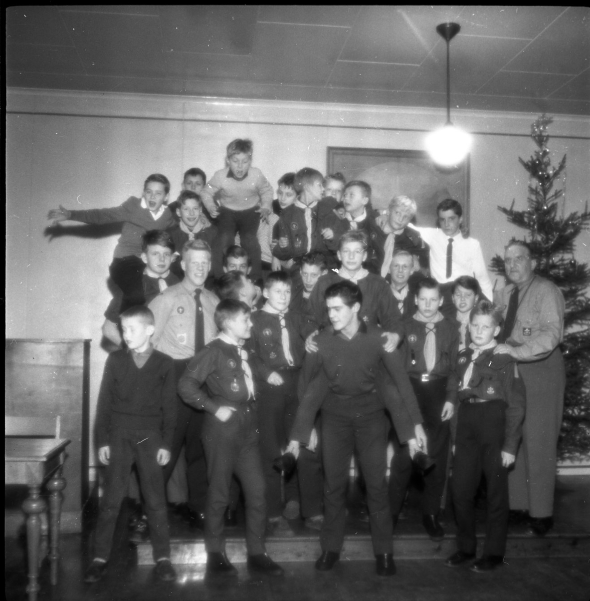 Barn och ungdomar står uppställda för fotografering. De har scouternas uniform på sig. En pojke sitter på en äldre pojkes rygg. Bredvid dem står en äldre scoutledare. Bakom dem står en julgran.