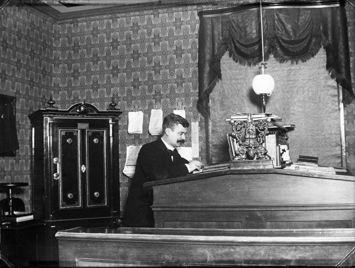 En okänd man med mustasch sitter vid ett större dubbelskrivbord. På väggen händer lappar på krokar. Rullgardinen är neddragen. Ett kontor?