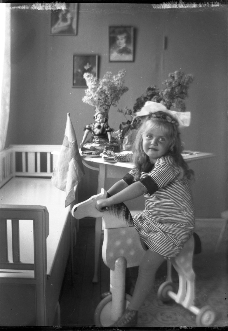En liten flicka sitter på en leksakshäst i en hemmiljö. På ett bord bakom henne sitter det en docka. Där står också ett par vaser med syrener?