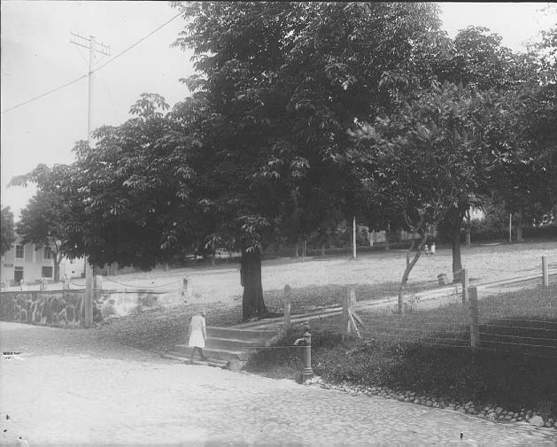 Sydvästra delen av torget i Gränna. En flicka i ljus klänning och hatt är på väg uppför trappan vid södra uppfarten. Trappans fortsättning är markerad med två rader av borgmästarsten. En vattenpump vid vägkanten till höger om trappan. Torget kantas av stora grönskande träd. Till vänster i bild skymtar kvarteret Ångbåten med skylt för Järnhandel.