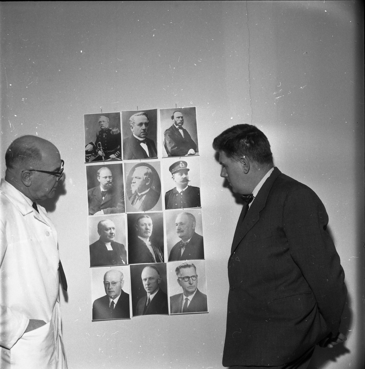 En bildserie med tolv porträttbilder föreställande ordförandena i kommunfulläktige sitter uppsatta på en vägg. Två män står och betraktar bilderna. Till vänster står Osse Gustafssonoch till höger står Sten Roman.