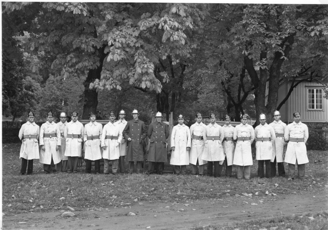 Gruppbild med 17 brandmän i långa rockar, brett bälte och pickethjälm på huvudet. Två av dem har en mörkt rock utan bälte, de övrig ljus rock. Enstaka med en yxa i bältet.