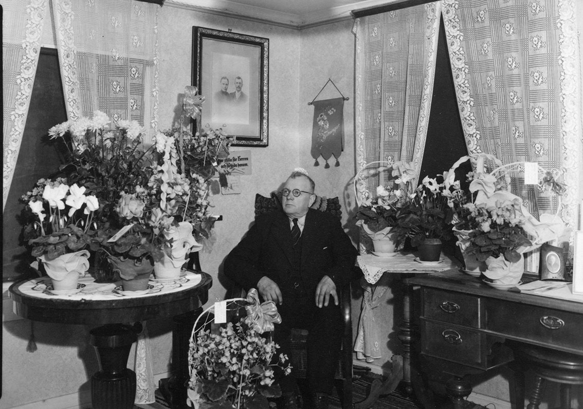 En man med glasögon sitter i en fåtölj omgiven av blomsterbuketter. Det är hans födelsedag.