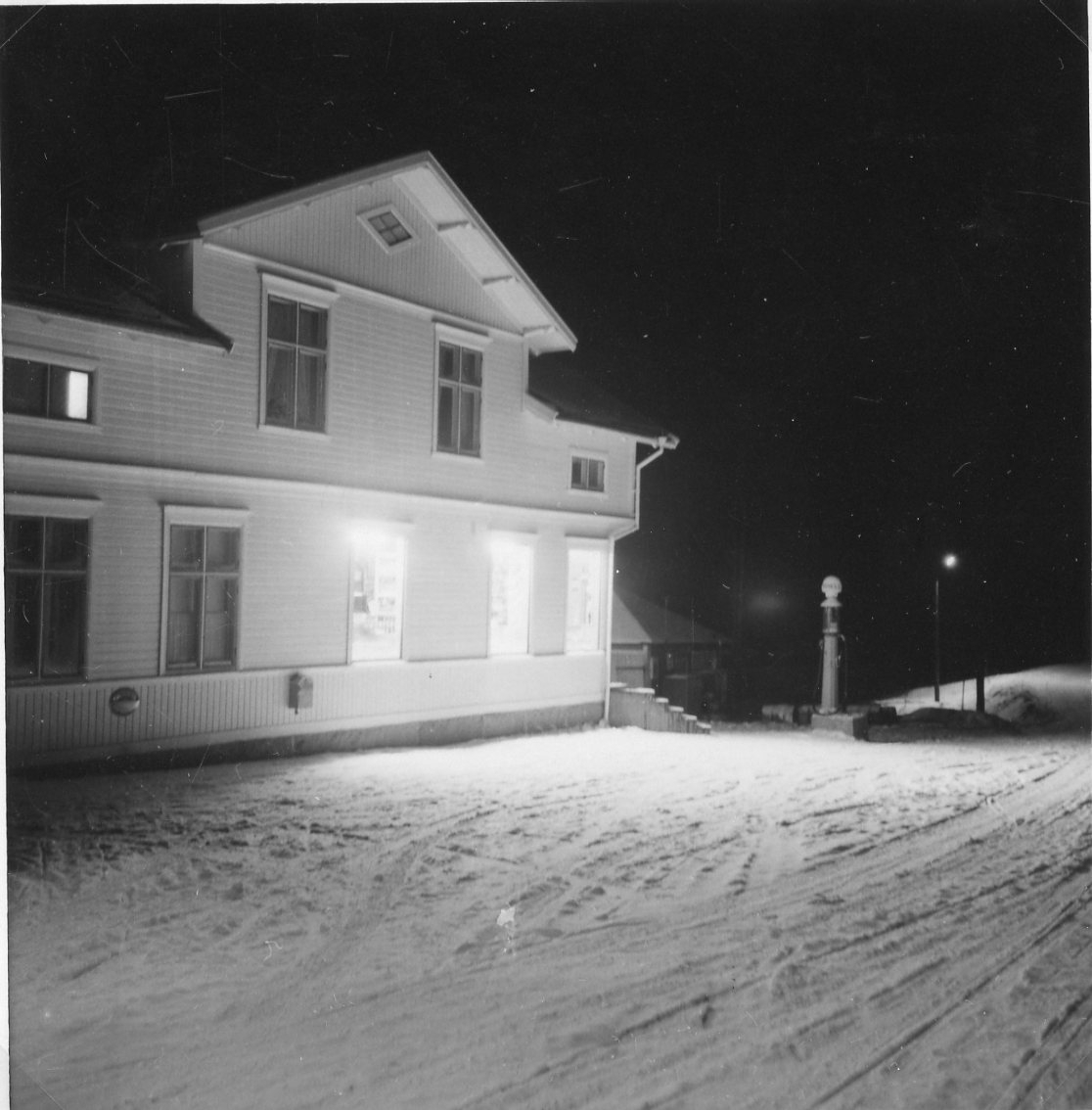 En affärslokal en vinterkväll. Det lyser i lokalen. En ljus byggnad i två våningar med frontespis och liggande panel. En bensinpump till höger.
