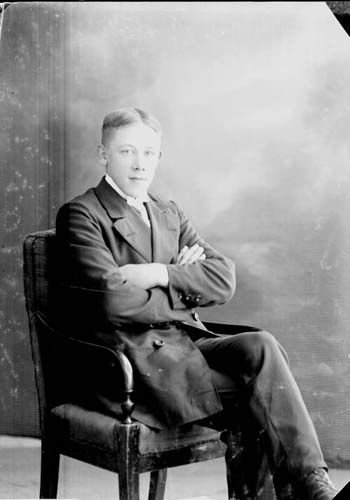 Porträtt av en yngling som sitter med armarna i kors på en stol.