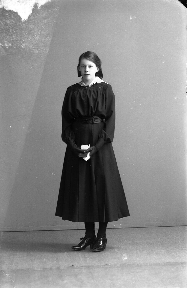 Porträtt av en flicka i mörk klänning. Hon håller en liten bok (psalmbok?) och en näsduk i händerna. Troligen konfirmationsbild.