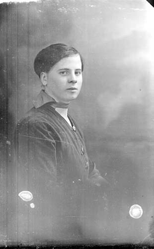 Bröstbild, profil, av en ung kvinna som vänder blicken mot fotografen.