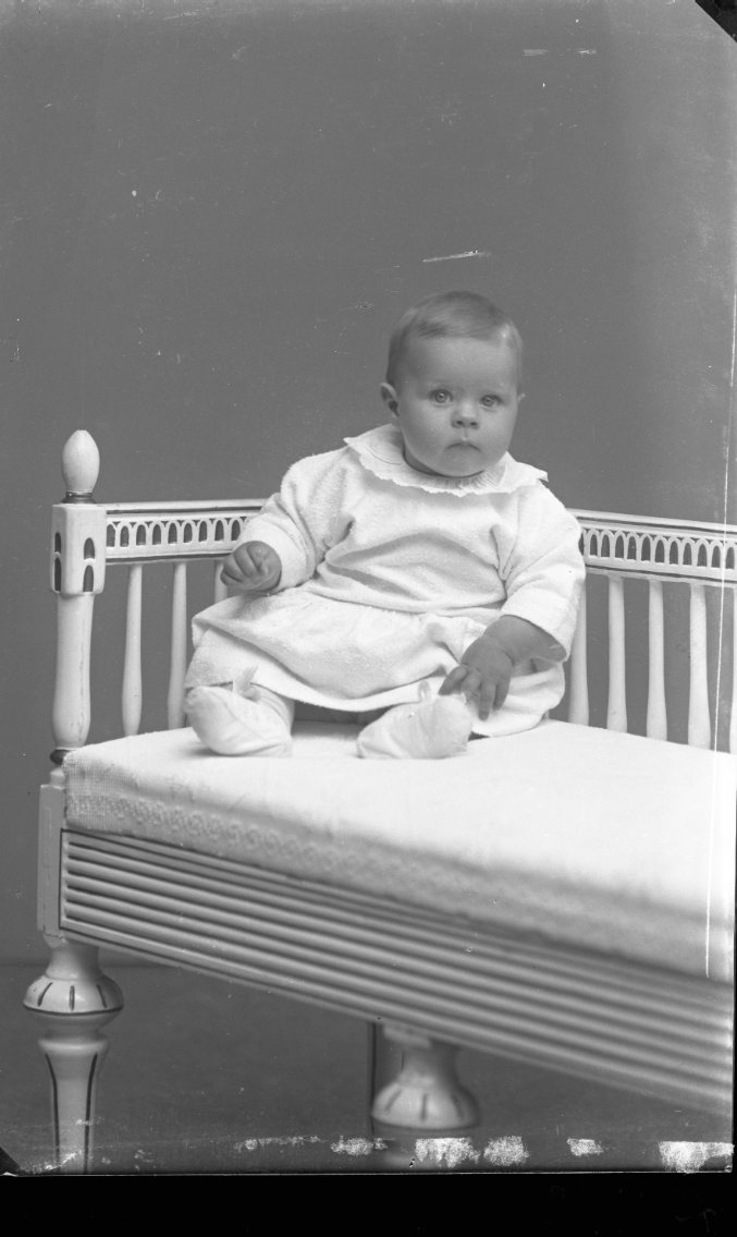 Porträtt av ett spädbarn, en pojke som sitter i en soffa av gustaviansk stil.