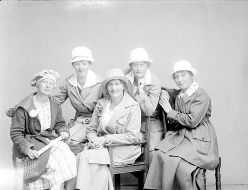 Gruppbild med fem kvinnor i ledig klädsel. Alla med hatt på huvudet. Kvinnan till vänster i rutig klänning, håller en ihoprullad tidning - sannolikt.