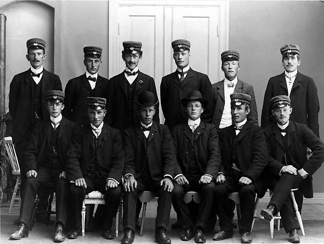 Tolv unga män fotograferade i en ateljé. Alla utom två - med hatt - bär keps med ett märke.