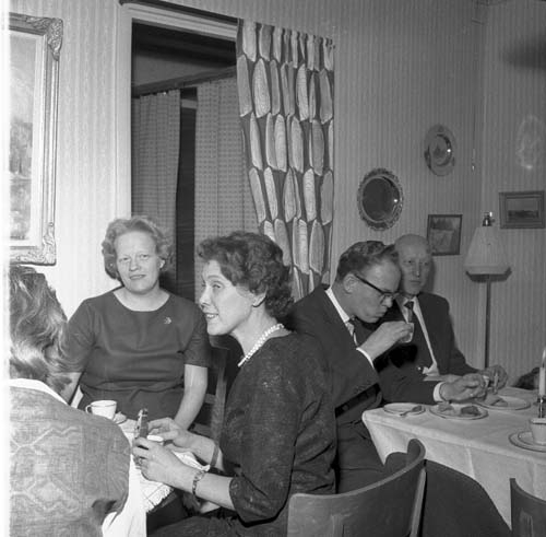 Kvinnor och män sitter runt fikabord. Det ligger en ung flicka på en soffa intill bordet.