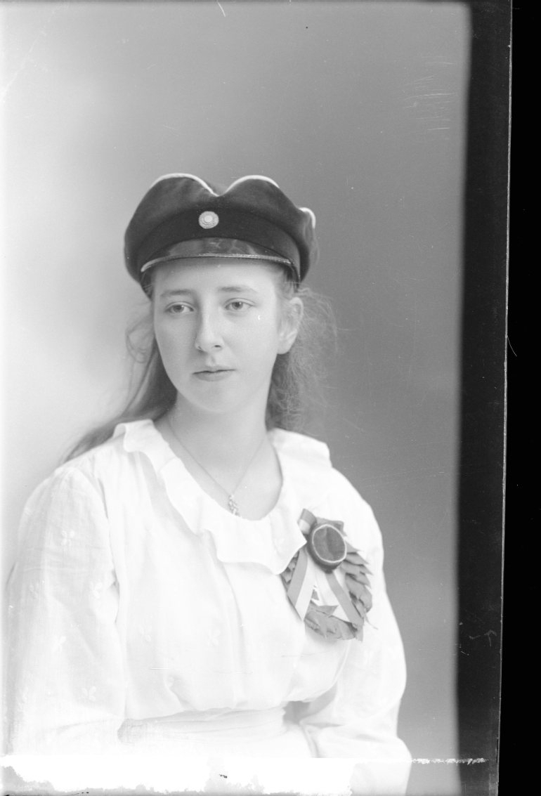 Porträtt av en flicka i tonåren med huvudbonad och någon form av utmärkelse på bröstet, troligen anknytning till utbildning.