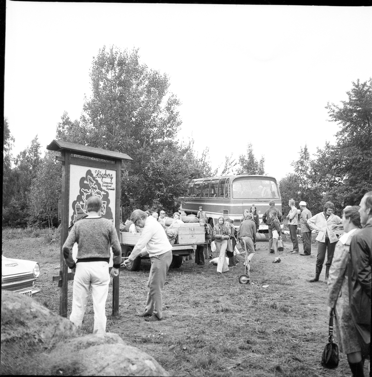 Två män vid en stor anslagstavla med karta över Högaberg; ungdomar och vuxna vid en buss.