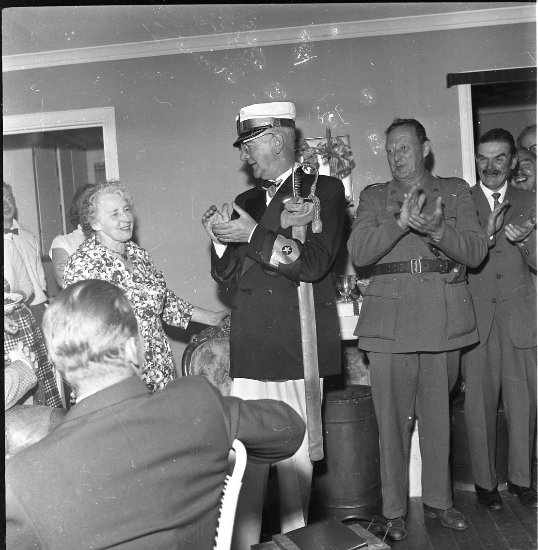 Spex i samband med Osse Gustafssons 60-årsdag. Han står i centrum i mörk kavaj, ljusa byxor och vit skärmössa med en värja under armen. Han liksom personer runtom applåderar.