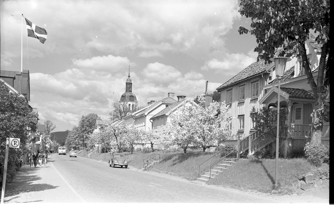 Brahegatan vid södertull i Gränna mot norr. En flagga är hissad på en fastighet till vänster. En Volkswagen kommer körande söderut.