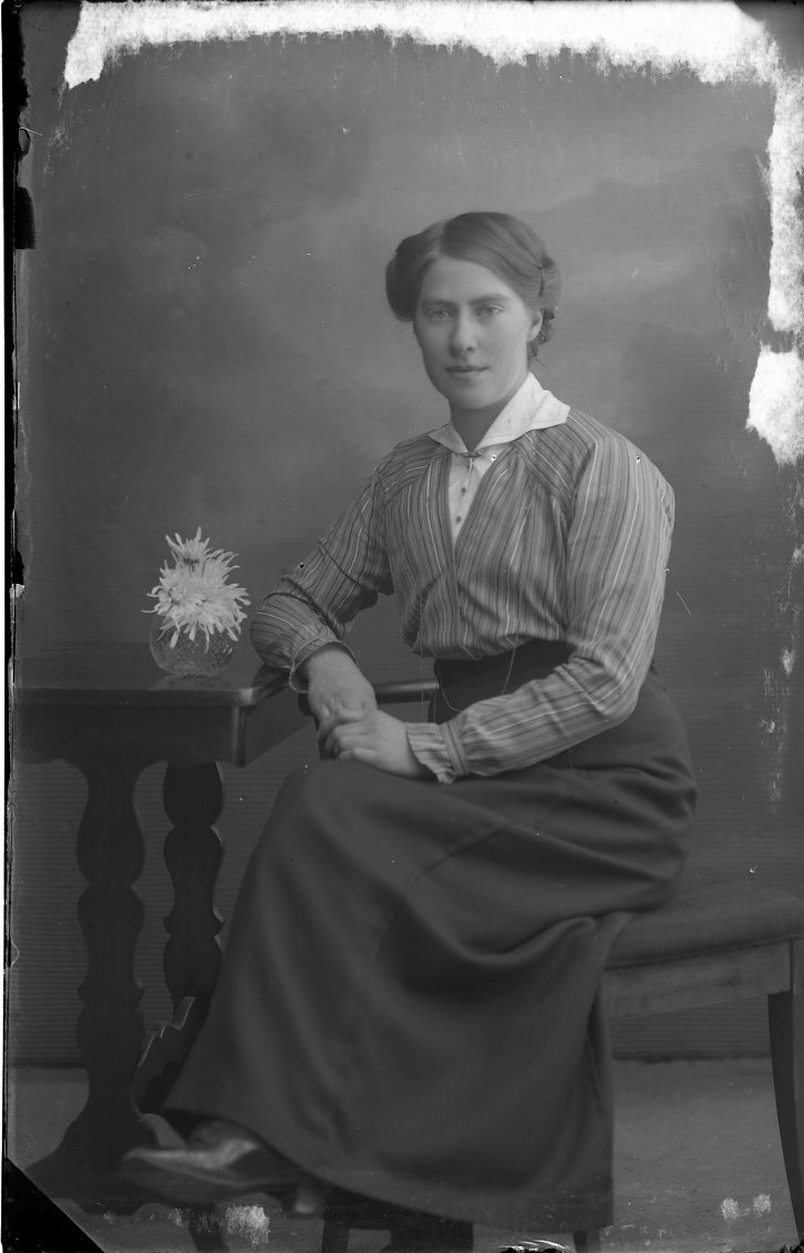Porträtt av en ung kvinna som sitter vid ett bord. På bordet står en liten rund transparent vas med blommor.