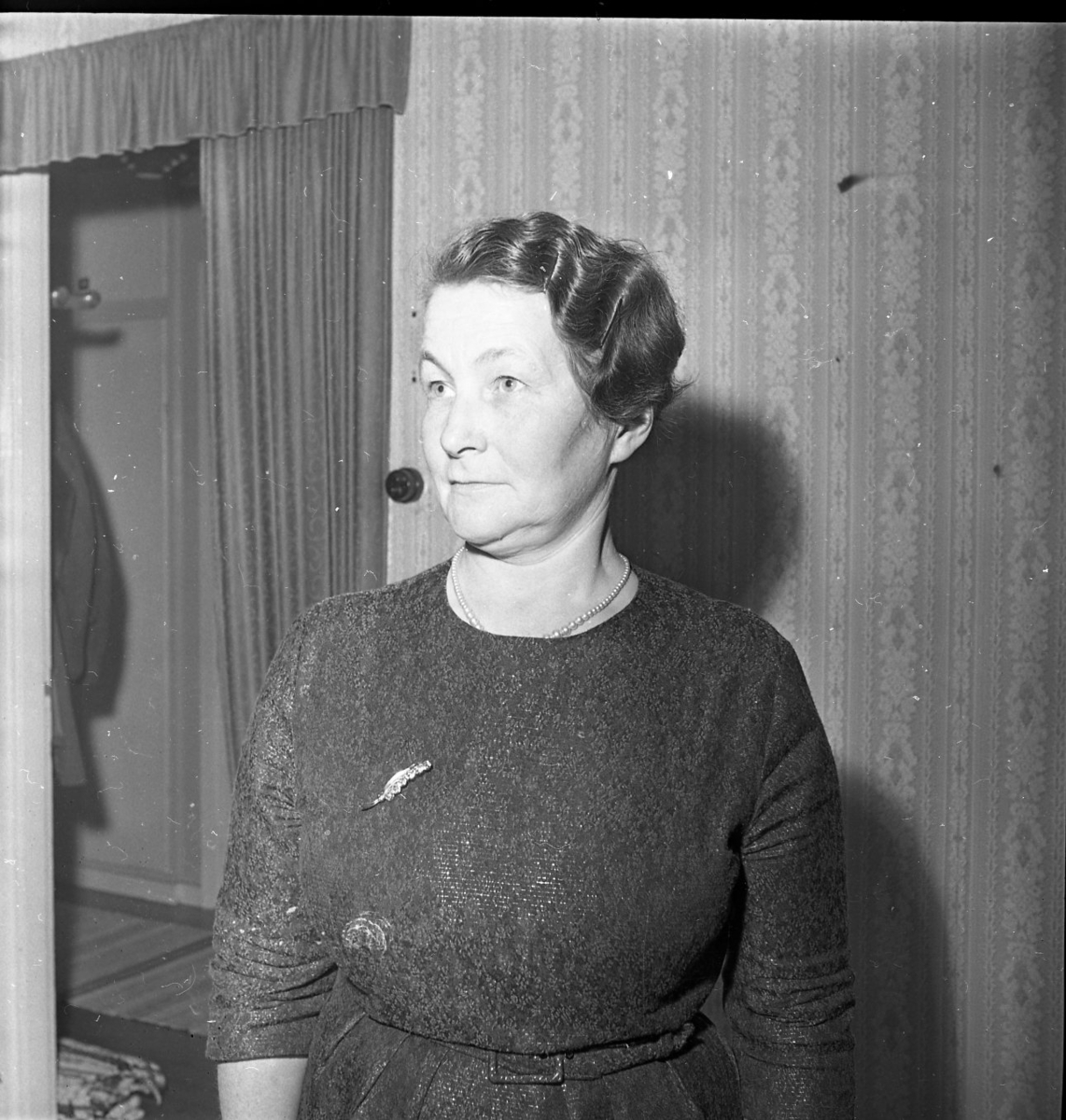 Porträtt av en kvinna. Hon tittar förbi kameran. Hon har kort lockigt hår. Hon bär en klänning med markerad midja med ett skärp. Hon har ett pärlhalsband och en brosch.