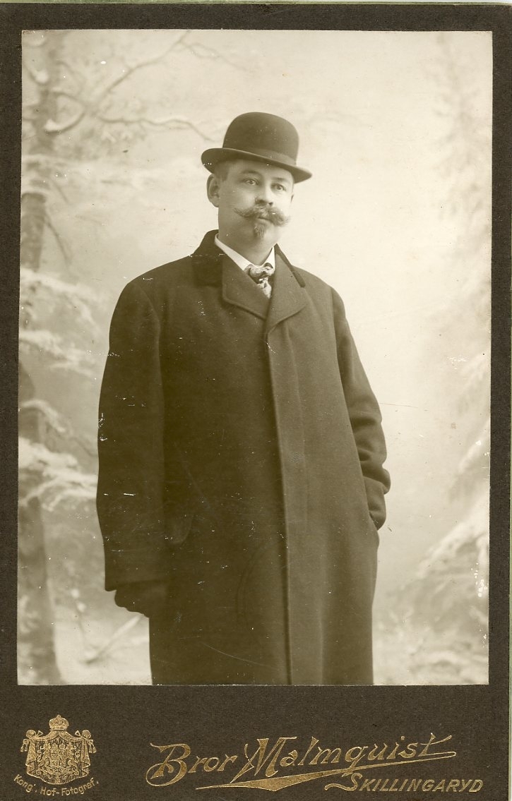 Kabinettsfotografi av en okänd man med skägg. Han bär ytterkläder och hatt.