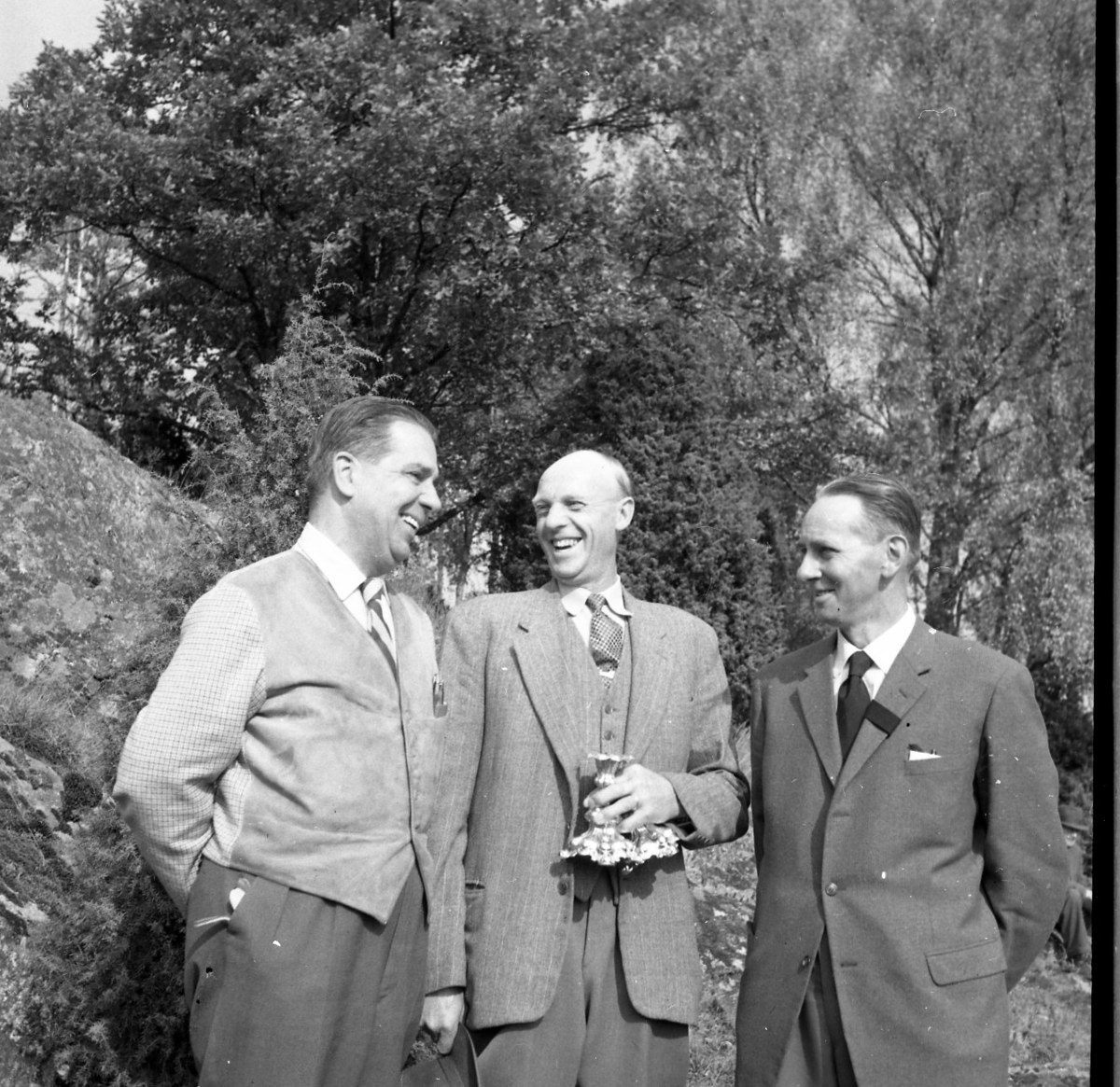 Tre män står axel mot axel och pratar. En man håller två ljusstakar i händerna.