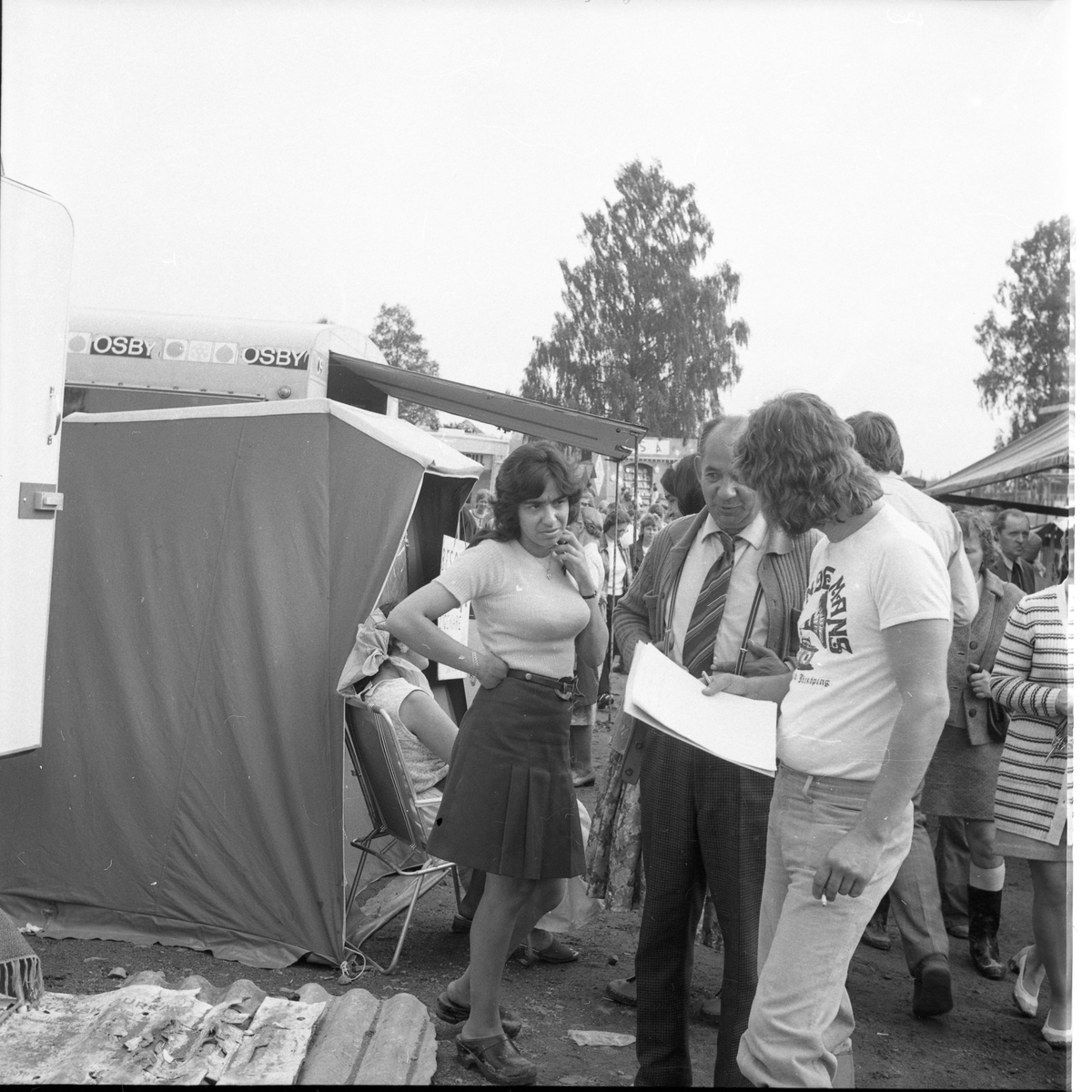 Två män i samtal ett marknadsområde. En kvinna står lite på avstånd och lyssnar.