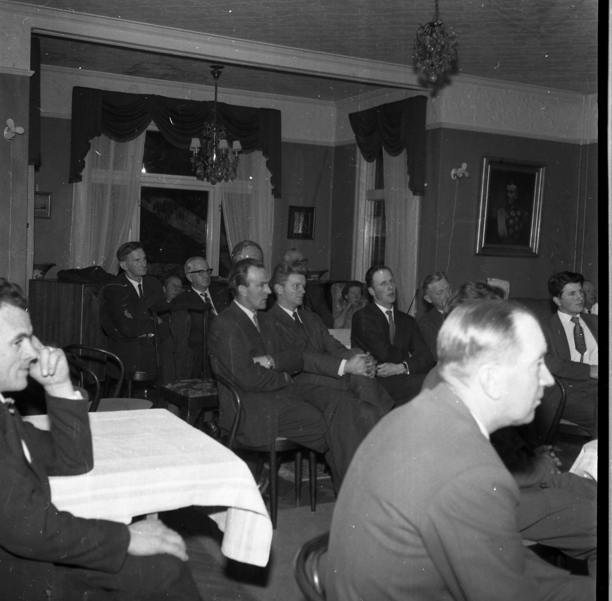 Ett stor antal män, i huvudsak, sitter samlade på Ribbargården. De tittar och lyssnar på någon utanför bild till höger. Till vänster sitter Alvar Grennvall och i mitten Paul Simonsson och Ragnar Rosenqvist. Till höger om dem, i mörkare kostym, Karl-Erik Gustafsson och till höger om denne sitter Edvin Johansson. Närmast i bild till höger sitter Albert Svensson.