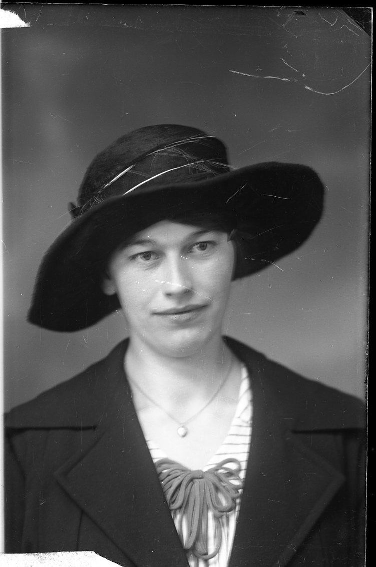 Porträtt av en kvinna i mörk stor hatt.