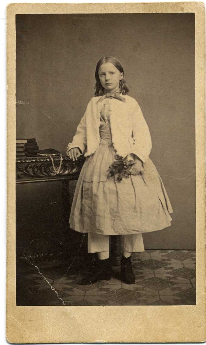 Porträtt av en flicka. Hon står vid ett bord där det ligger böcker och en liten handväska. I vänster hand håller hon en blomsterbukett.