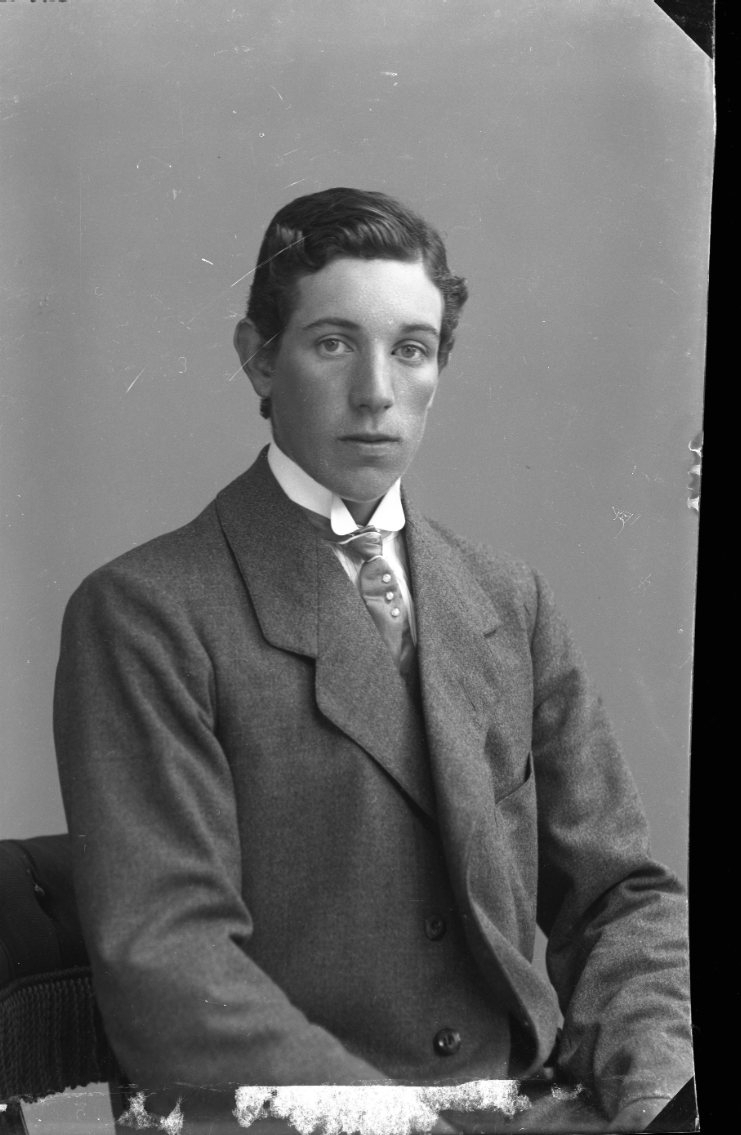 Porträtt av en ung man i finkostym som sitter på en stol.