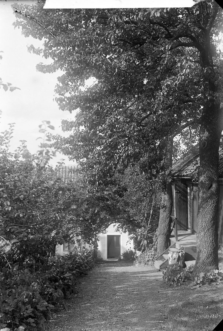 En grusad stig kantad av höga träd på höger sida och buskar på den vänstra leder ned mot en putsad byggnad. På andra sidan träden ligger en uthuslänga i sutteräng.