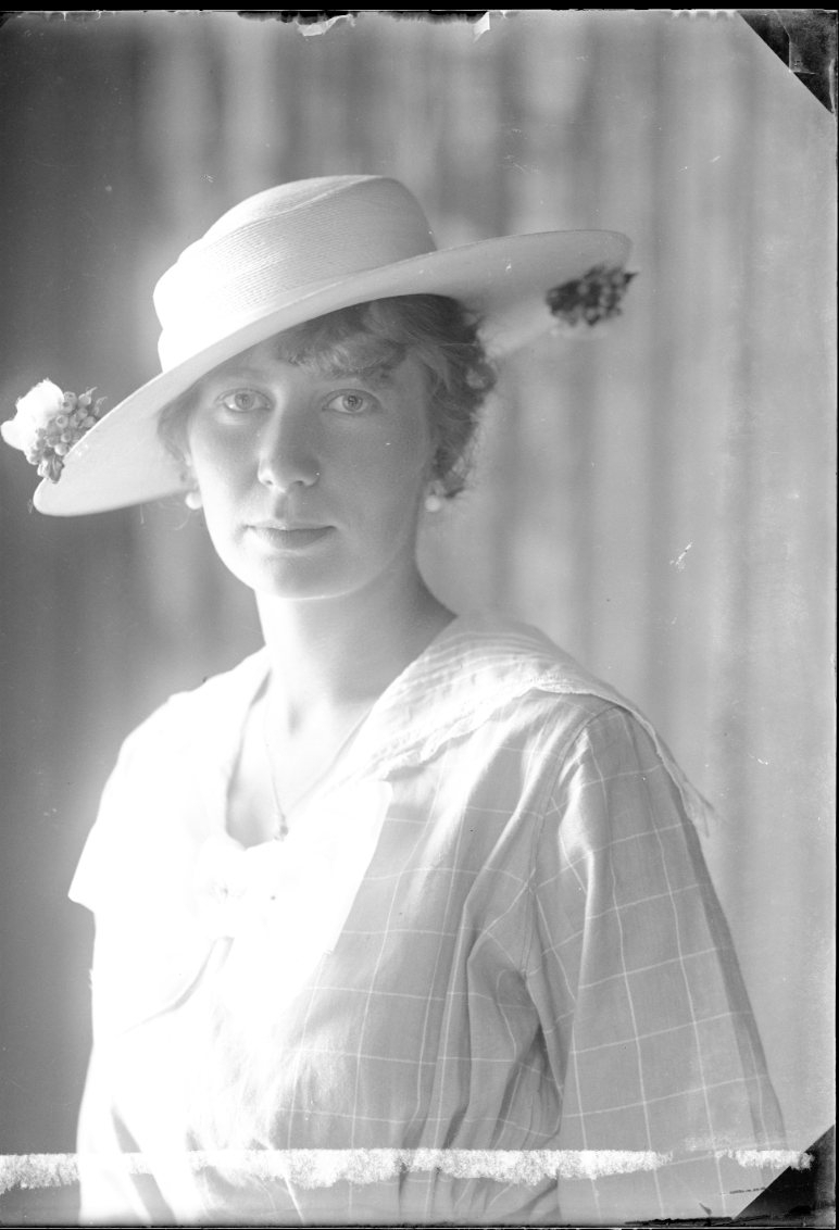 Porträtt av en ung kvinna i ljus rutig klänning och hatt lite på snedden.