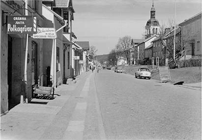 Södra delen av Brahegatan mot norr. Fastigheter närmast till vänster skyltar med: "Gränna Äkta Polkagrisar", "Richardsons Mjölk Specerier - Frukt", "Glasmästeri" och "Antikvitetsaffär". En trehjulig flakcykel står parkerad utmed husväggen. Trottoaren har en rad med borgmästarsten. Enstaka bilar står parkerade på andra sidan vägen.