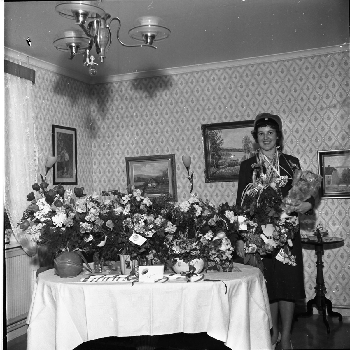 Porträtt av en ung kvinna som tagit realen. Hon står i hemmiljö med blommor och ballonger.