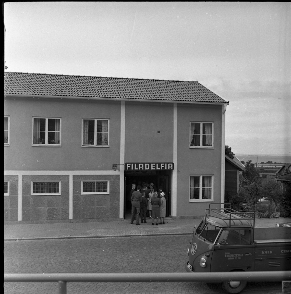 Besökare på väg in till Filadelfiakyrkan. En VW-pickup från "Firma Byggmaterial" står parkerad på Brahegatan.
