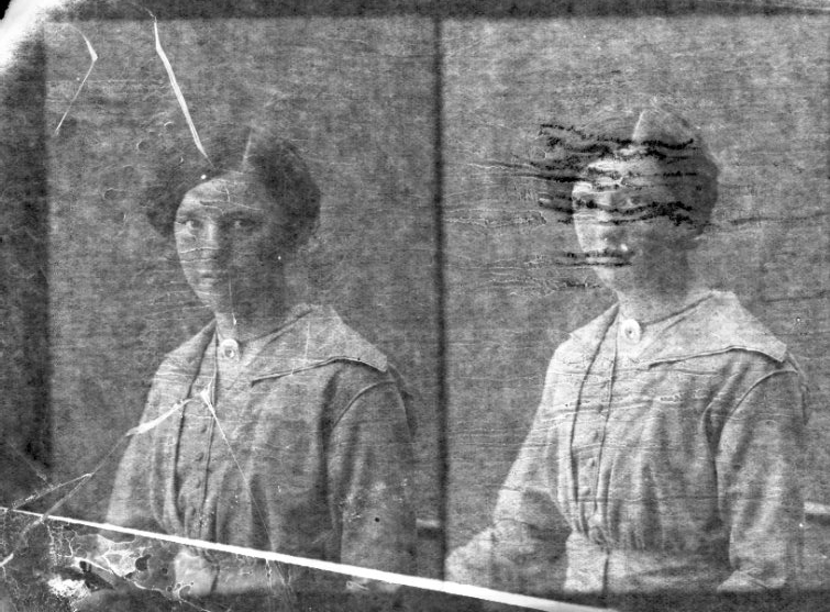 Bröstbild av en ung kvinna. Två bilder på samma glasplåt.