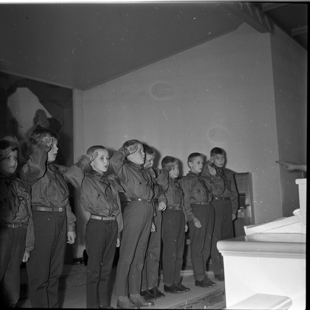 Pojkar står på rad framför ett altare. De bär uniform och gör honnör.