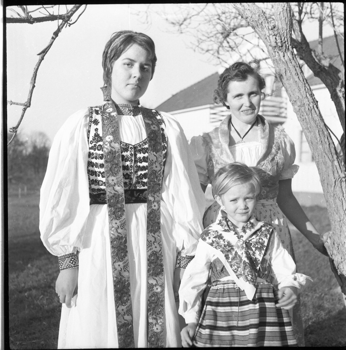 Två kvinnor och en flicka står uppställda för att fotografers. De bär folkdräkter. Kvinnan till vänster bär en vit särk och ett broderat livstycke med blommor. Två band med blommor hänger över hennes axlar. Särken har breda mönstrade manschetter. Flickan, som står emellan de två kvinnorna bär en blommig sjal över axlarna. Hon bär ett randigt förkläde. Kvinnan på flickans vänstra sida bär särk med puffärm, blommig överklänning och ett förkläde.