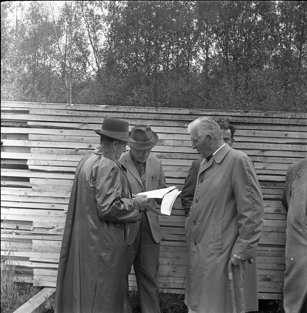 Skogsdag Örserums brunn 1961. Tre män står och läser i några papper. En bär en regnrock, en annan håller i en käpp. Bakom dem står en trave plankor.