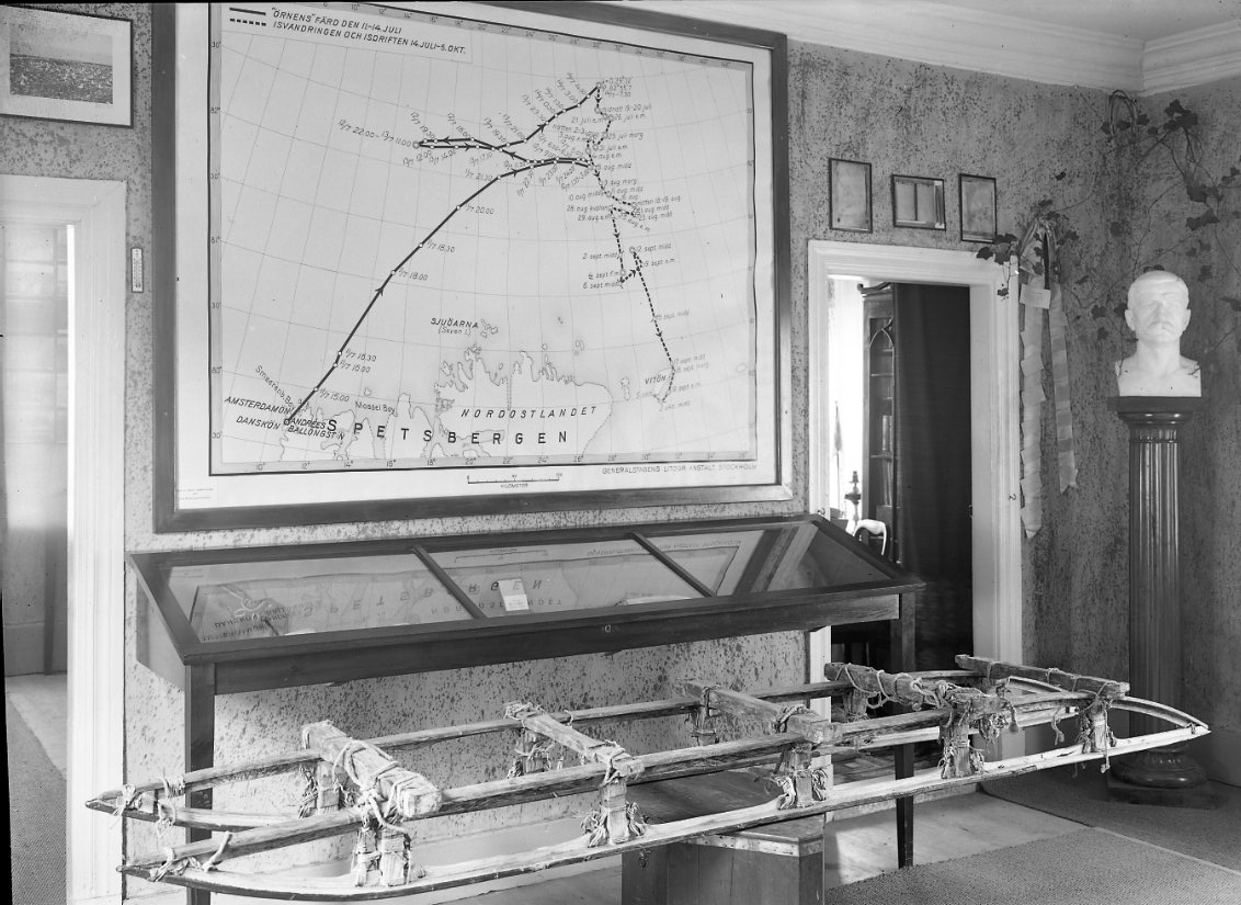 Interiör från Andréemuseet i Franckska gården. En expeditionskälke står framför en stor karta som visar Andréexpeditionens flyttrutt och drift på isen. En Andrée-byst i ett hörn till höger.