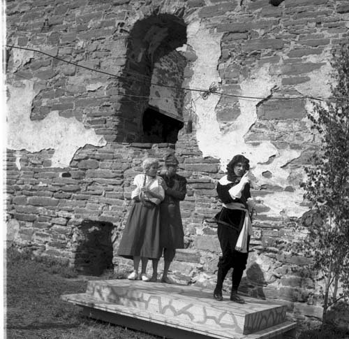 Tre skådespelare står på en utomhusscen. Scenen står intill en ruin.