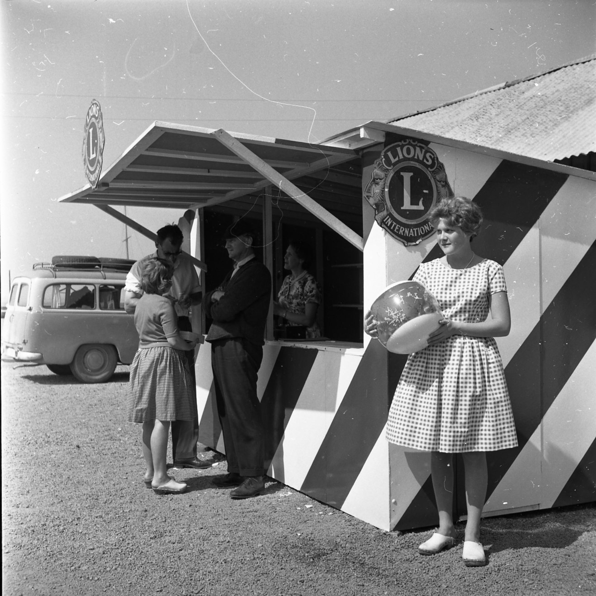 En ung kvinna, Ewa Heldebrandt, i prickig klänning står vid gaveln till ett lottstånd med skylt för Lions. Hon håller en rund skål i händerna, kanske en lottvinst. Lottförsäljaren är hennes mamma, Birgit. Tre personer köper lotter, Rune Skoglund till höger. Sannolikt marknad i Gränna Lions regi. Troligen vid Gränna hamn.