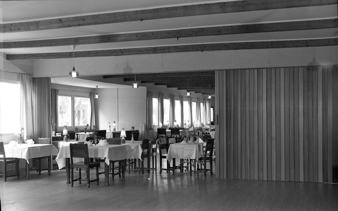 Dukade bord i en stor matsal, en stor vikbar dörr delar av rummet.