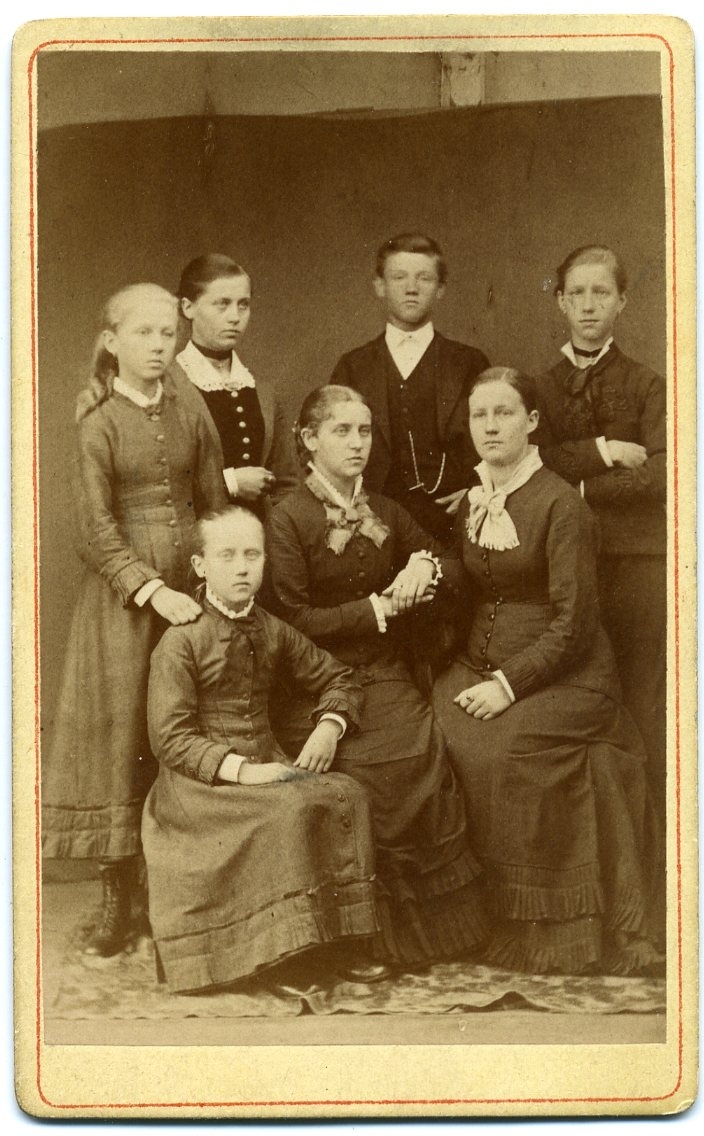 Kabinettsfotografi: gruppbild med de 7 syskonen Ryman. Sittande fr vänster: Sigrid, Agnes och Anna. Stående fr vänster: Jenny, Lisen (Elisabeth), Nils samt Hilda.
