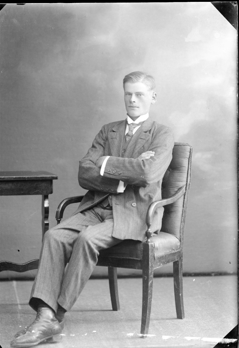 Porträtt av en ung man som sitter i en stol med armarna i kors.