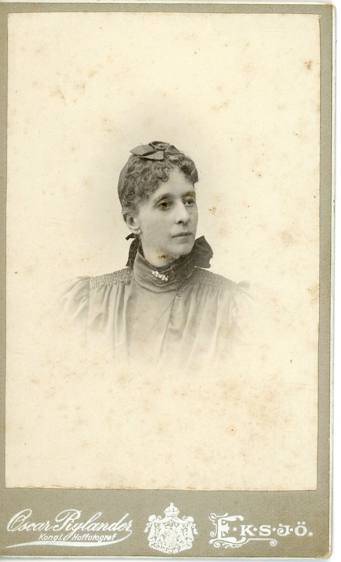 Kabinettsfotografi av en okänd kvinna i ytterkläder med hatt med tunnt band knutet under hakan. Hon håller ett par ljusa handskar i vänster hand.